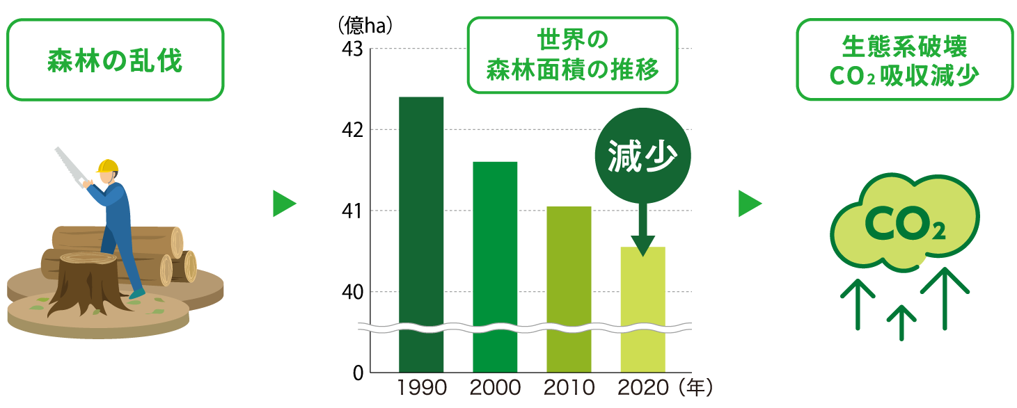 国際的な木材の需要の高まりもあり、東南アジアやアマゾンでは違法伐採が後を絶たないといわれています。違法伐採が行われることで、生態系の破壊やCO2吸収減少が懸念されています。