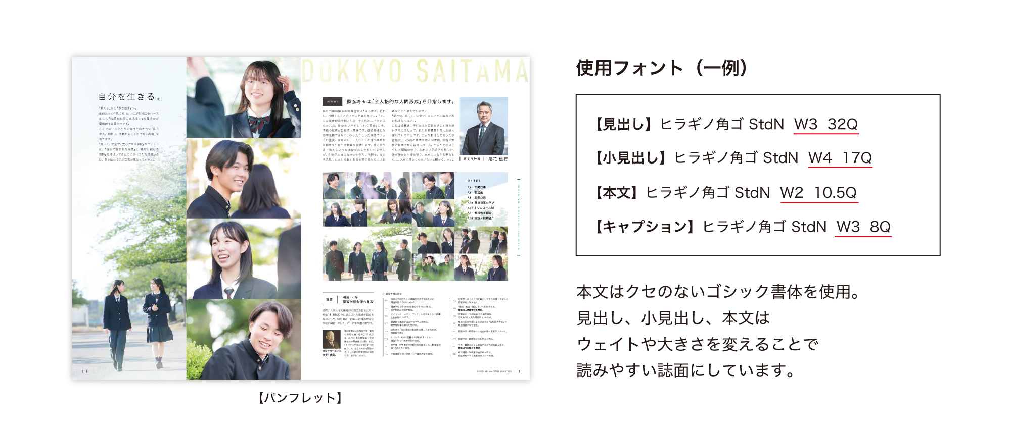 雑誌や本、カタログなど、長い文章を扱う「エディトリアルデザイン」では「読ませる」ことが中心になります。長文を気持ちよく読めるように、可読性の高い書体が選ばれるのが特徴であり、本文には落ち着いた明朝体や見やすいゴシック体、見出しには少し個性のある書体など、役割に応じて書体を使い分けます。